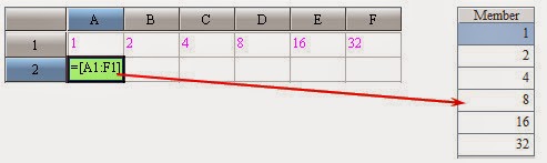In the A2 expression, the [A1:F1] indicates a sequence composed of all cells in the A1~F1 area.